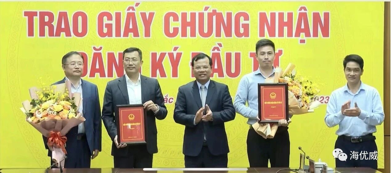 【2023年5月4日,越南,北江省】越南北江省投资登记证颁发仪式于五月四日下午在北江省政府举行。北江省副省长范世俊先生亲自向海优威总经理李民先生颁发证书,意在支持和鼓励海优威在越南建设胶膜工厂的投资计划。仪式上,双...