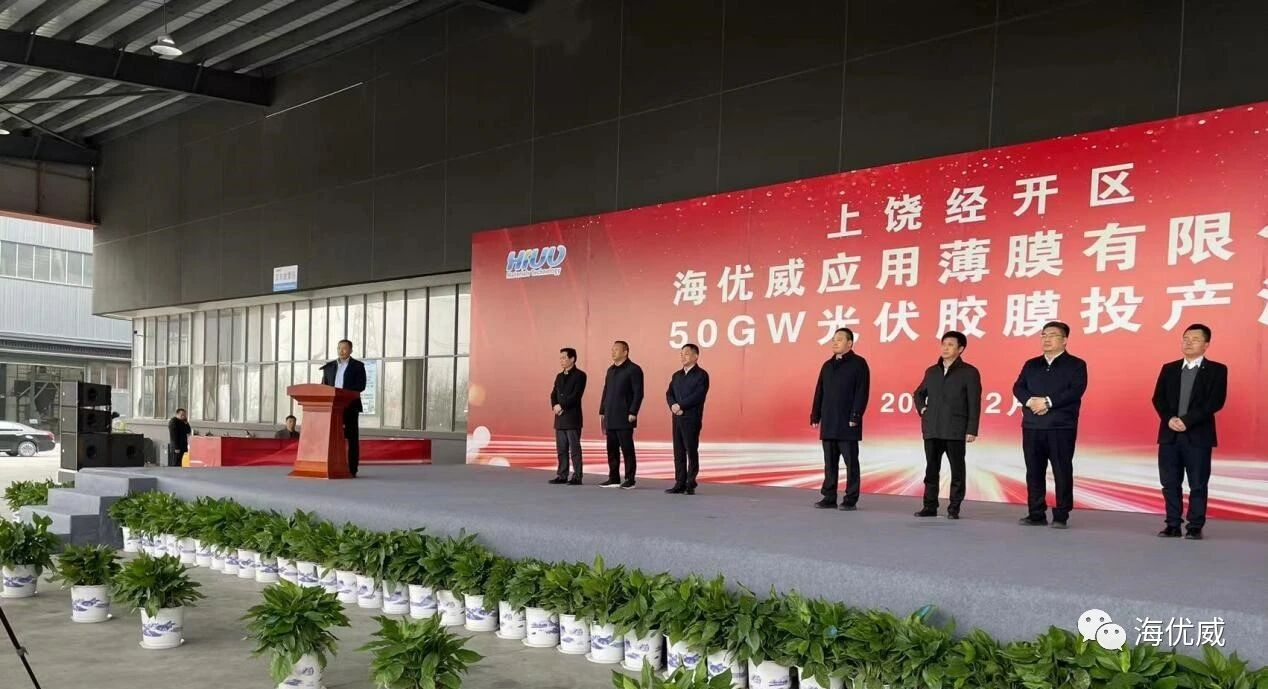2月15日下午三点,海优威在江西上饶工厂隆重举行上饶海优威应用薄膜有限公司50GW光伏胶膜投产仪式。上饶市市委陈云书记,邱向军市长携其他政府相关部门领导,海优威总经理李民,以及众多合作伙伴共同出席了本次投产仪式。在...